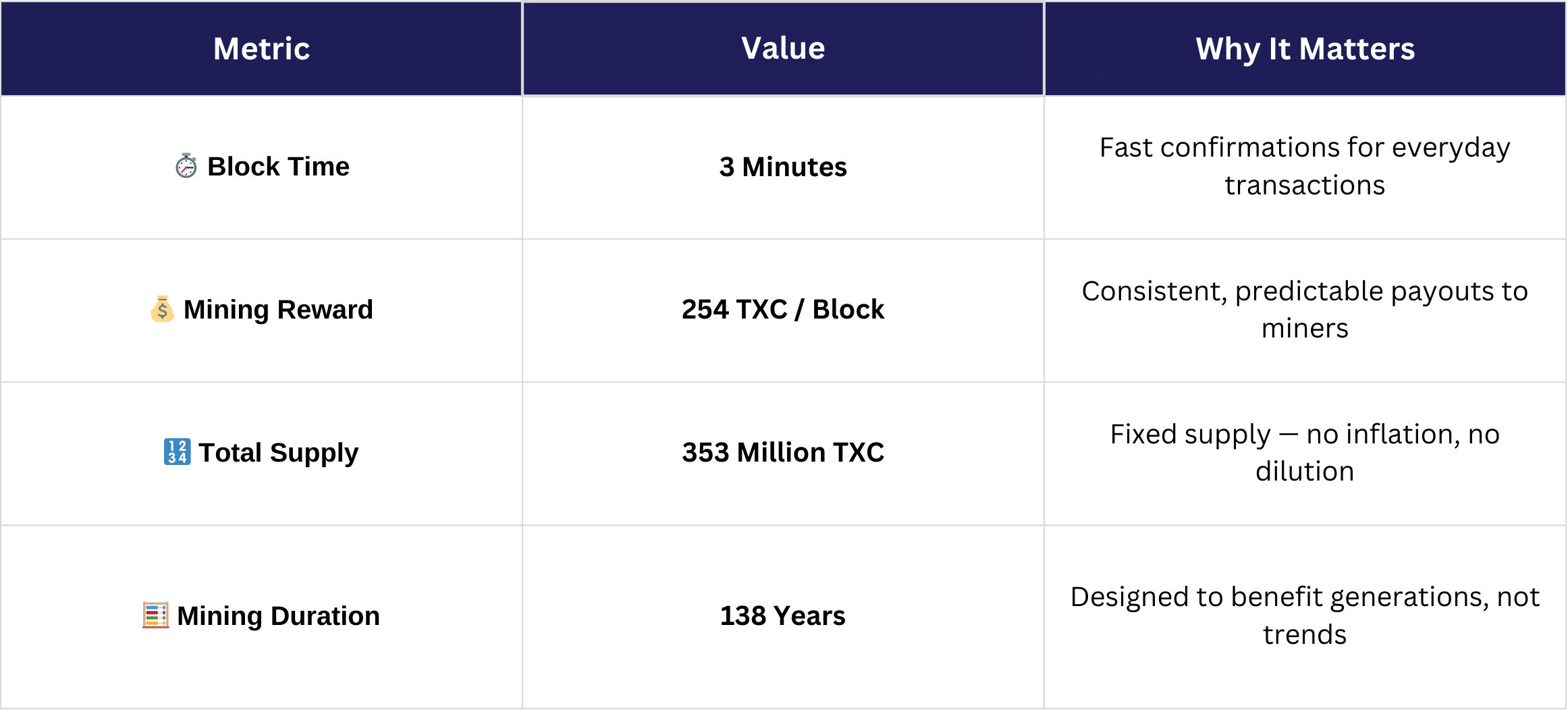 From that moment forward, your mining position earns daily TXC rewards—automatically, for the life of the project.
